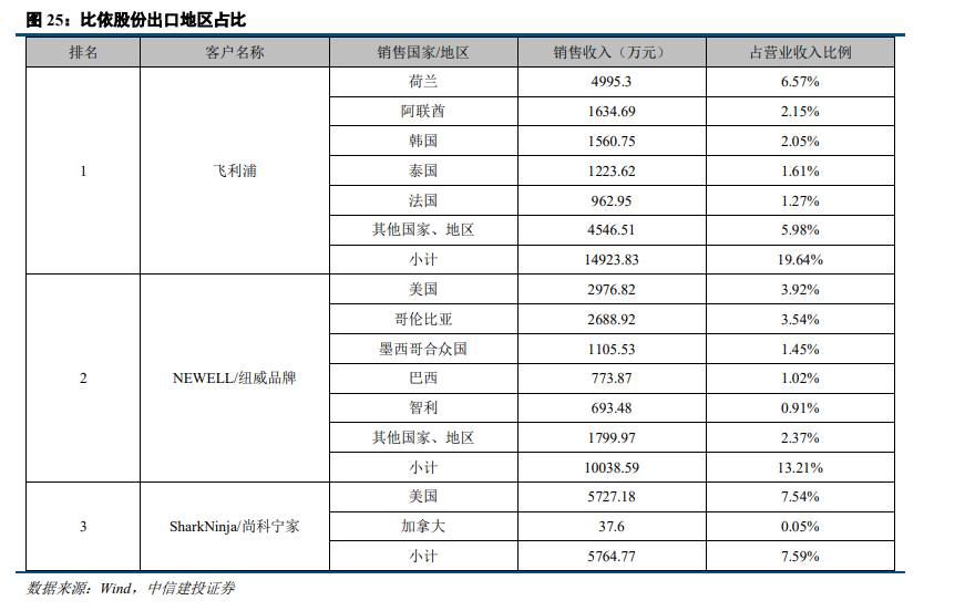 以厨房小家电为例,根据国内小家电代工龙头品牌新宝股份的招股书数据显示,公司厨小电品类的出口地区分布中,主要集中于欧洲、北美、亚洲等地占比还相对较低。与新宝类似,主营空气炸锅代工的比依股份,其头部客户出口市场也基本集中于欧美等国家。