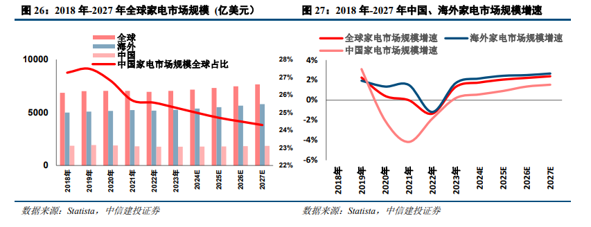 国内市场规模仅占全球家电市场规模的1/4,全球占比持续下降。Statista数据显示,2022年全球家电市场收入规模达6943.20亿美元,其中中国家电收入为1774.34亿美元,占全球市场收入的25.56%,国内仅占全球家电消费量的1/4。预计到 2027 年全球市场规模将达到7645.48亿美元,中国市场规模将达到1857.14亿美元。2021年-2027年预计中国家电市场规模全球占比逐年下降,外销市场的绝对空间充足。