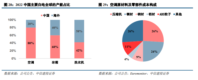 从白电全球产能角度来看,空调生产主要集中于中国,22年家用空调产能布局中,中国占比高达80%,除中国外,东南亚,欧洲等地也分布有部分产能。冰洗产能分布较为多元,具体看,冰箱冰柜产能布局中,中国占比为60%;洗衣机产能布局中,中国占比为42%。