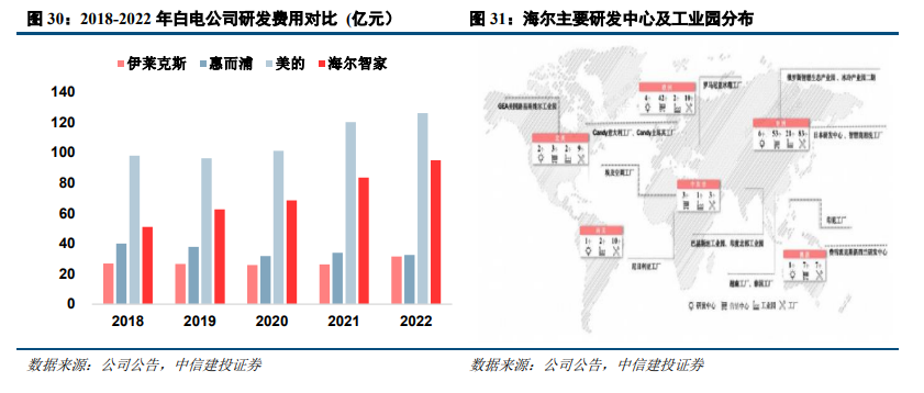 除此之外,中国家电企业还持续推进降本增效,创新推新,发挥全球化研发协同优势,创新驱动带来的高产品力叠加创新与规模化生产带来的性价比优势,帮助中国家电企业在海外家电市场的竞争中更好地胜出。近年来中国三大龙头白电企业研发投入强劲、投入规模逐年扩大,2018-2022 年,较惠而浦、伊莱克斯、大金工业等世界其他龙头企业,美的、海尔集团的研发投入明显较高。中国三大龙头白电企业通过并购和自身建设构建了囊括研发、采购、生产制造、销售等多环节的全球化体系。截至2023年,海尔在全球已拥有“10+N”大研发中心、25个工业园、122个制造中心、108个营销中心。格力公司在国内外建有77个生产基地,16个研究院,美的集团在全球12个国家设有35个研发中心,形成“2+4+N”全球化研发网络。全球化研发协同,整合全球人才、技术、设施和资金等研发资源,多元化创新提升产品力。