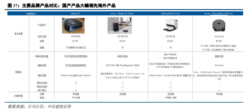 研发投入的加大和研发效率的优化,助力国产品牌技术创新、增强产品力。近年来国产扫地机品牌的研发费用逐渐提高,研发人员数量占比和研发效率不断优化,具体表现在国产产品技术至少领先海外一代,且定义产品的方向,围绕用户需求及其体验,持续引领海外市场产品创新;通过技术和功能的创新,国产品牌打造高端产品,热销产品定价可在1000美元以上,逐渐开拓海外市场、受海外消费者认可。