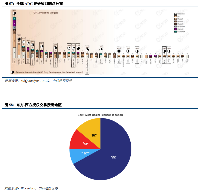 中国创新药全球竞争力持续提升。ADC是全球肿瘤创新药物领域重要趋势,但因其要素较多,其药物开发更多是一种偏技术的研发,而不是靶点或机制的创新。ADC领域有较大空间进行组合创新,而组合创新更讲求效率和化药能力;中国因其产业链完整,工程师人数众多,在DS-8201出现后,之前跟随罗氏T-DM1所积累的经验和建立的平台可以帮助中国Biotech迅速跟进相关管线,国内企业在ADC领域已经具备出色的全球竞争力。据Biocentury统计,中国大陆作为授权交易授出方,在东方向西方授权中,占比达到67%,超过日本,成为第一大授出地区。