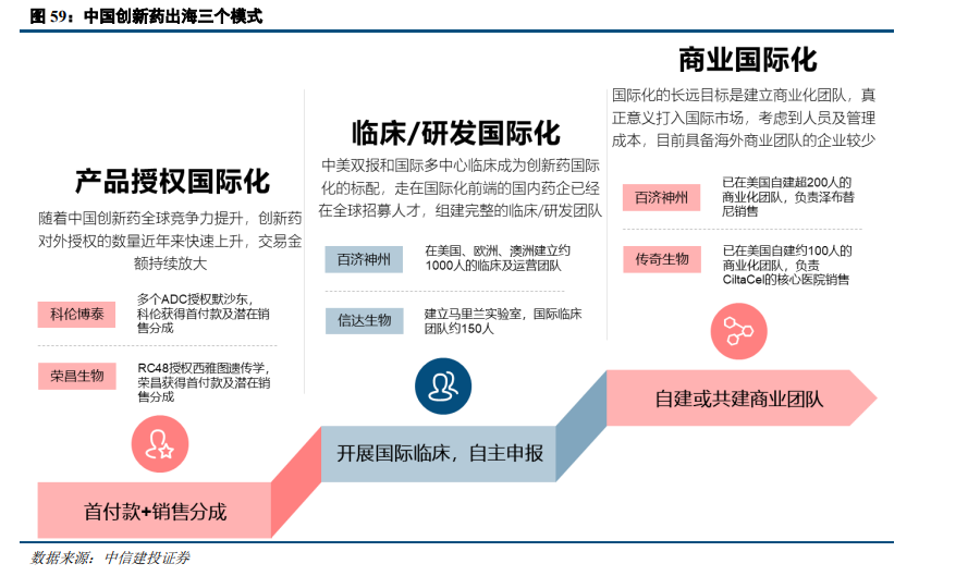 中国创新药出海模式“三步走”。第一种模式是“产品授权国际化”,即授权+提成模式,该模式授出方获得首付款、里程碑即销售分成,在我国创新药企当前缺少国际运营能力的背景下仍为主流模式;第二种模式是研发及临床国际化,目前出现在部分头部企业中,这一模式资金需求大,对团队的国际化要求高;第三种模式是商业国际化,该模式可以获取潜在最大利润,但也是难度最大、风险最高的模式,目前只有极少数公司实现。