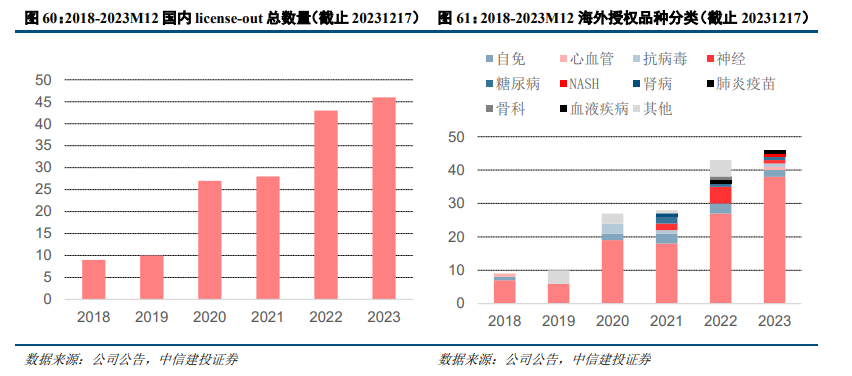 中国创新药授权出海进入收获期。2020年后国内药企license-out数量明显增加。随着国内创新药企的快速发展,国内创新药及技术平台license-out交易日益活跃。我国创新药自2012年开始,交易数量逐渐增长。2020年以后更是进入高速增长阶段,23年license-out交易的数量达到46个。