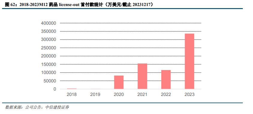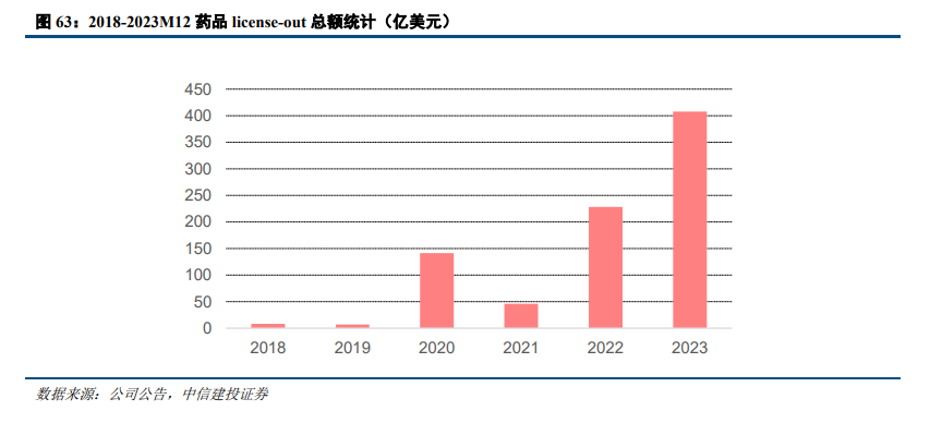 2020年后国内药企license-out首付款及总额明显增长。2018-2019年国内药企license-out的首付款以及总金额相对较低,主要由于海外授权的药物部分为仿制药/生物类似药,创新药处于较早阶段。2020年,随着国内创新药企业的快速发展,海外授权的首付款金额以及总金额明显增长,2023年全年,根据已经披露金额的交易统计来看,全年首付款总额达到33.6亿元,交易金额总量达到407亿美元,从具体交易产品来看,更多是创新药的海外授权,同时部分商品已经在国内进入商业化阶段,在海外开展临床及获批成功率较高,体现出我国创新药企业的整体快速发展。