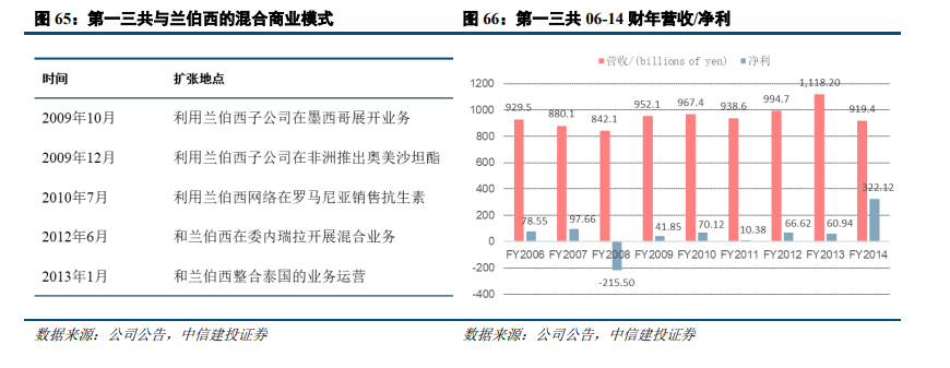 公司完成整合后,寻找的业务方向之一是仿制药。2008年6月,公司宣布计划以46亿美元收购印度最大的仿制药企业兰伯西(Ranbaxy)。但随后兰伯西因为造假问题陷入FDA调查之中,也导致公司在2008财年计提了399亿日元用于美国司法部索赔。此后几年公司借助兰伯西打开了更多国际市场,但这笔收购始终没能带动公司的发展。最终于2014年第一三共以40亿美元将兰伯西出售给了太阳制药,时任第一三共CEO Takashi Shoda也因此辞职。