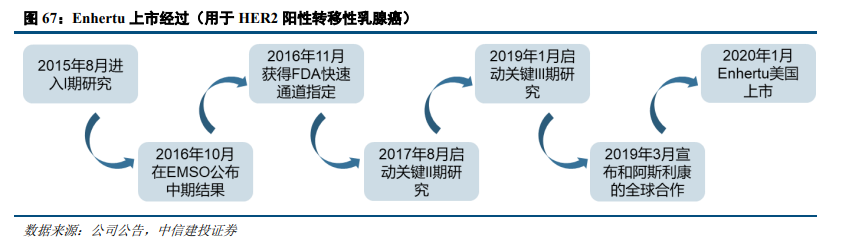 第一三共的ADC研发始于2010年,当时的抗体基于前三共的抗体研究和蛋白质工程能力而创建,而药物有效载荷和接头则是来自前第一制药的相关研究。不过由于当时其他公司已有HER2-ADC的研究在进行,第一三共的ADC研发曾一度搁置。2013年,第一三共成立了生物制剂研发部门,以开发包括ADC在内的各类创新药,研究人员在筛选和优化了数百种抗体、接头和有效载荷的组合,最终生产出第一三共第一款ADC:DS-8201。而由于其优异的临床效果,这款药物从临床开始到最终上市仅用了不到5年时间