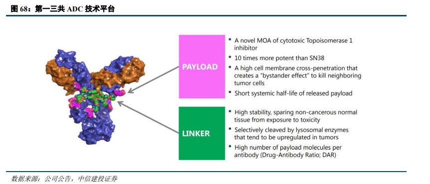 第一三共目前已成功搭建起自己的ADC技术平台。相比大多数ADC产品优势明显,主要体现在:1)更高的药物-抗体比例(DAR)。多数被批准的药物DAR介于2-4之间,而第一三共可以在一个抗体上偶联8个药物分子;2)独特高效的载荷。第一三共开发的拓扑异构酶I抑制剂DXd,其体外活性是常用的SN-38(伊立替康的活性代谢物)的10倍;释放后血液半衰期更短,可以迅速从血液中消除,减少引起副作用的可能;3)更稳定高效的接头。第一三共的linker在体内稳定性优异,大大减少了有效载荷释放到血液中的可能。而与癌细胞抗原结合后,又可以被在癌细胞中高度表达的组织蛋白酶精确切割,释放有效载荷;4)旁观者效应。第一三共的DXd具有更高的亲脂性和膜渗透性,在ADC与抗原表达阳性的癌细胞(如HER2阳性)结合后,DXd从癌细胞中的ADC释放出来,穿透细胞膜,对临近癌细胞(抗原表达阳性或者阴性)也可产生细胞毒作用。