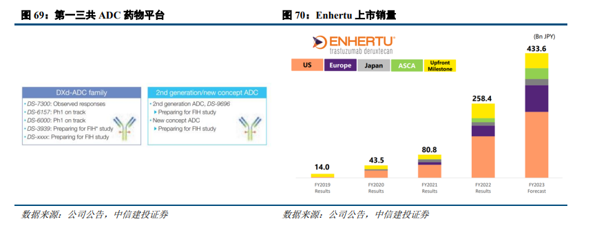 2019年,阿斯利康以69亿美元对价与第一三共合作开发和商业化Enhertu,自Enhertu上市以来,销量持续走高,2023年全年销售额超过23亿美元,已经成为全球销售额第一的ADC产品;2020年,阿斯利康继续投入60亿美元对价与第一三共合作开发和商业化Dato-DXd。截止2022年3月,公司基于DXd-ADC平台的药物除了上述3种外,还有DS-7300等共5个候选药物;而在DXd平台之外,也已经开始布局第二代ADC技术,已有DS-9696准备进入人体实验。