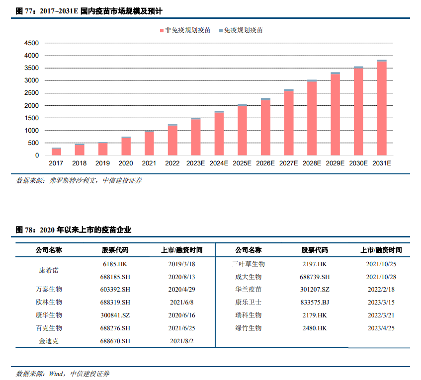 中国疫苗市场快速发展,疫苗企业数量增长较快。中国疫苗市场近年来呈现快速发展趋势。根据弗罗斯特沙利文测算,2022年中国疫苗市场规模达1251亿元,预计将于2031年达近3835亿元,2022~2031年复合增长率为13.3%。同时,随着疫苗相关的技术创新持续发展,以及政策对创新疫苗研发的支持,更多的企业投入疫苗相关的研发生产。加之资本市场对疫苗行业的投入热情高涨,疫苗上市企业数量持续增长,一级市场公司融资活跃。