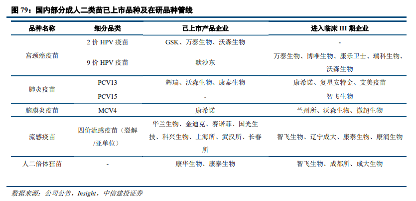 产品管线趋于同质化,热门品种扎推。随着一类苗市场逐渐萎缩,各家疫苗企业均重点布局成人二类苗,其开发路径基本跟随海外大型疫苗企业已上市产品或在研管线,管线布局趋于同质化。宫颈癌疫苗、肺炎球菌结合疫苗等热门品种已有多家企业布局。由于我国成人二类苗市场仍处于发展阶段,人群接种意识仍然偏低,尚需进行大量的市场教育,短期内市场规模提升难度较大,未来市场竞争格局预计趋于激烈。