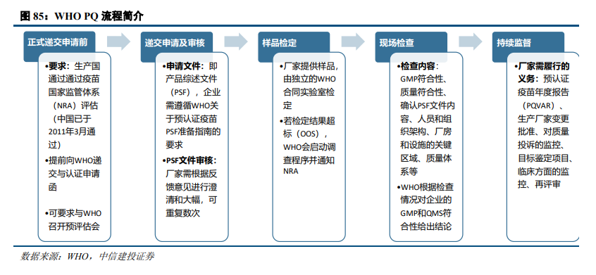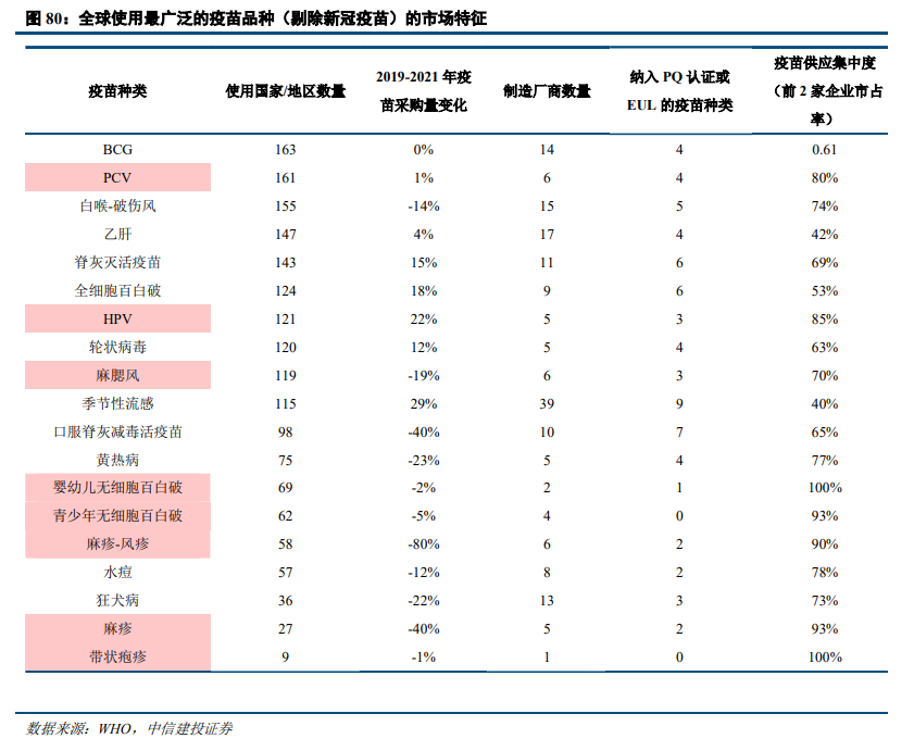 全球多款疫苗供应短缺,市场健康状况不佳。根据WHO发布的《2022年全球疫苗市场报告》,全球范围内多种疫苗存在供给风险,主要的原因包括疫苗厂商数量偏低、通过WHO PQ认证或EUL的疫苗种类偏低、供应集中度偏高、产品相对较新(短期内供给相对不足)或非常成熟(厂家生产意愿低)等。对于这些疫苗品种,全球需要有更多的厂商参与供应,以缓解疫苗市场供应短缺。