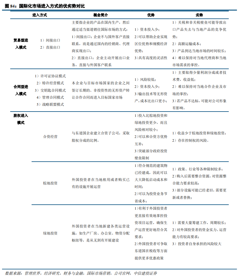 国际化进入方式多元化,可差异化选择。企业进入国际市场的过程就是企业将其自身拥有的资源,比如技术、资金、自身品牌或者管理经验等,通过多种投资方式渗透到东道主国家或地区的企业国际化经营战略实施过程。企业进入国际市场的模式可分为三类:1)贸易型进入模式:直接出口或者间接出口企业自身产品;2)合同型进入模式,包含多种细分模式,最大优势在于只授权无形资产,几乎没有额外投入;3)股权进入模式,其中合资经营最大优势在于可以在突破部分政府投资壁垒限制的同时和合资方形成优势互补;独资经营的棕地投资和绿地投资则各有优劣。
