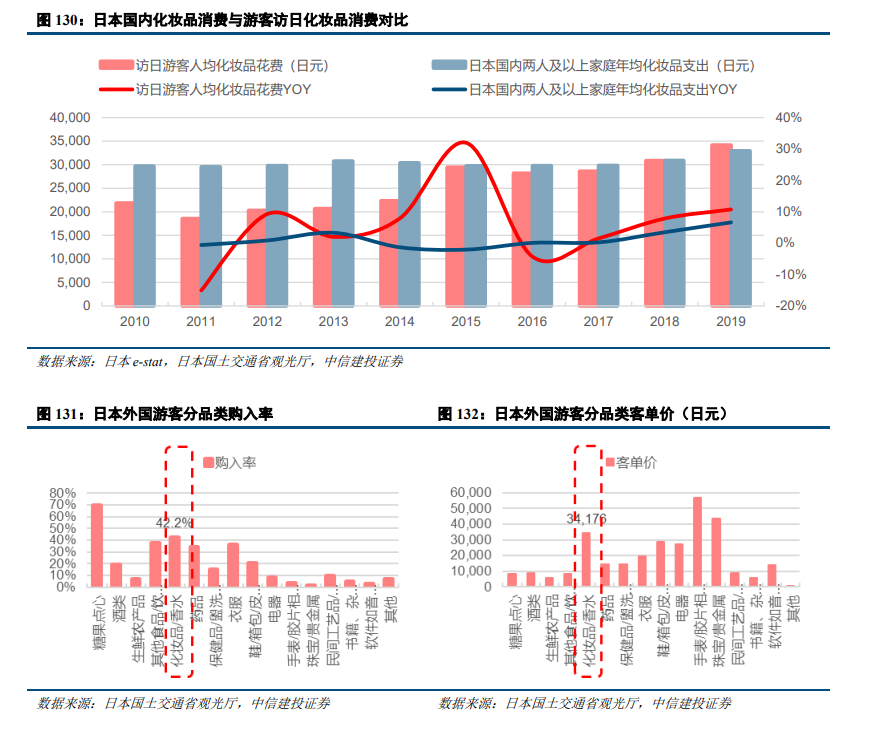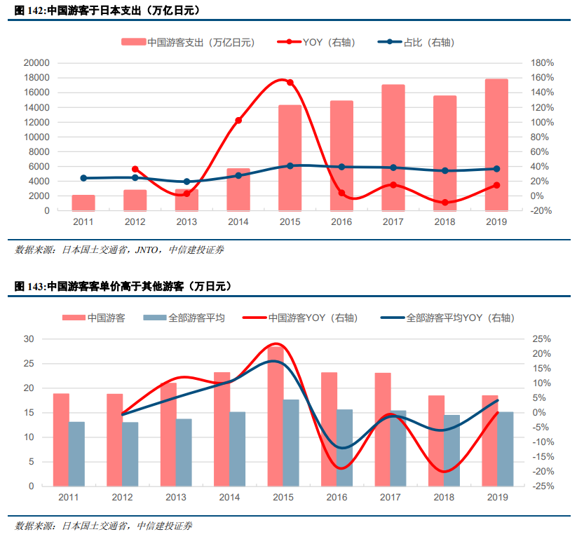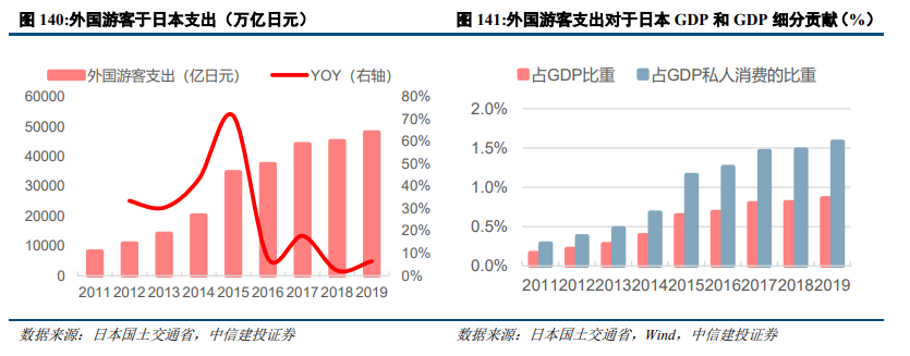 外国游客拉动日本国内消费,中国游客客单价高于平均水平。外国游客在日本的消费支出逐年提升,2011年游客消费支出占GDP比重为0.16%,占GDP私人消费比重为0.29%,2015年日本外国游客支出同比增长71%,创下10年以来最高增速,此后外国游客支出对于日本经济和消费贡献占比稳步提升。其中,中国游客支出高于其他平均游客,中国游客支出在外国游客支出占比中最高。