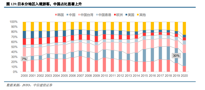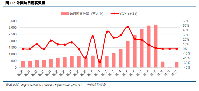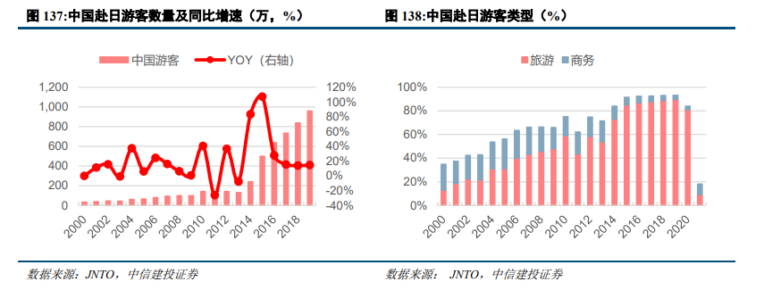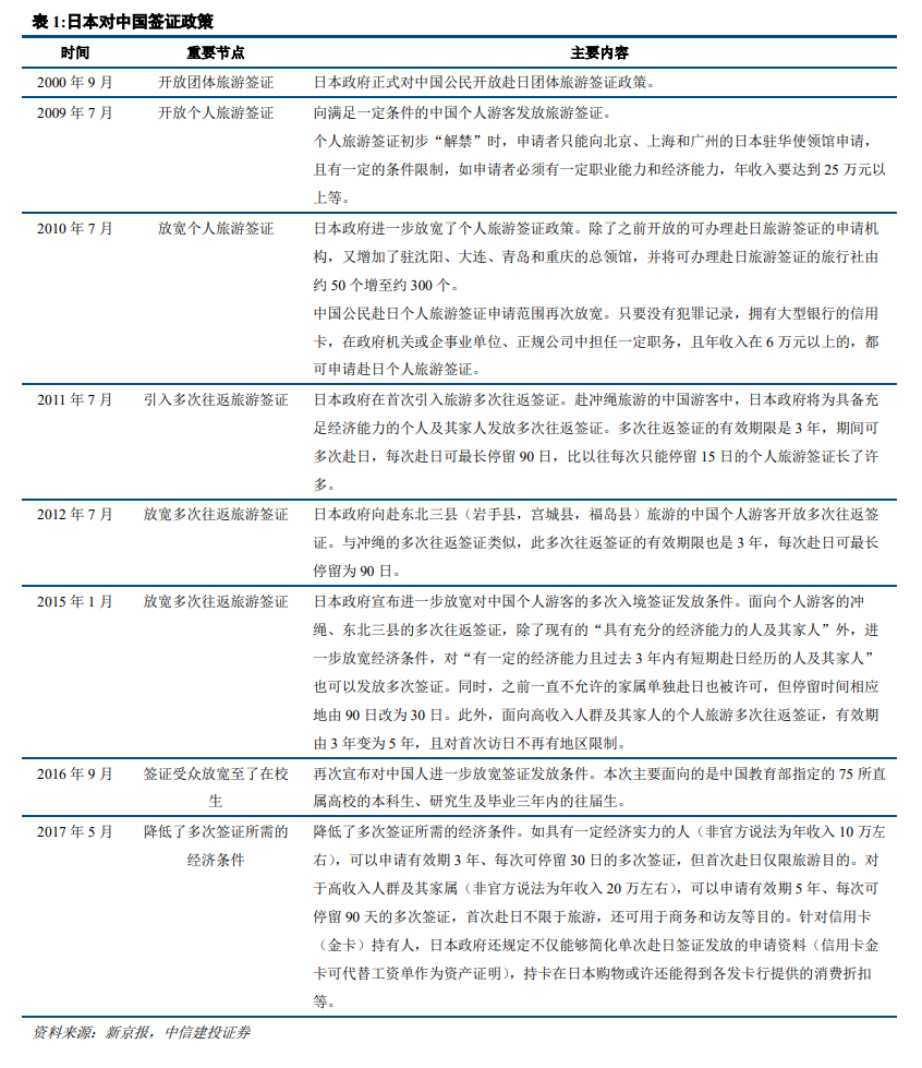 中国出境游发展红利及放宽对华签证。中国居民收入水平提升,出境游快速增长。日本对于中国不断放宽签证政策,2010年以后开放个人旅游签证,此后不断放宽签证条件,扩展游客群体和增加往返时间。