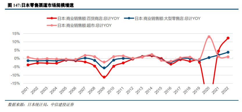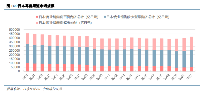 日本零售市场相对饱和,线下渠道整体没有增长。2000年-2019年日本百货商店销售额、大型零售店销售额、超市销售额复合增速分别为为-2.4%、-0.8%、0.2%。日本线下渠道中的超市维持小幅增长,百货销售额与大型零售点销售额均出现收缩。