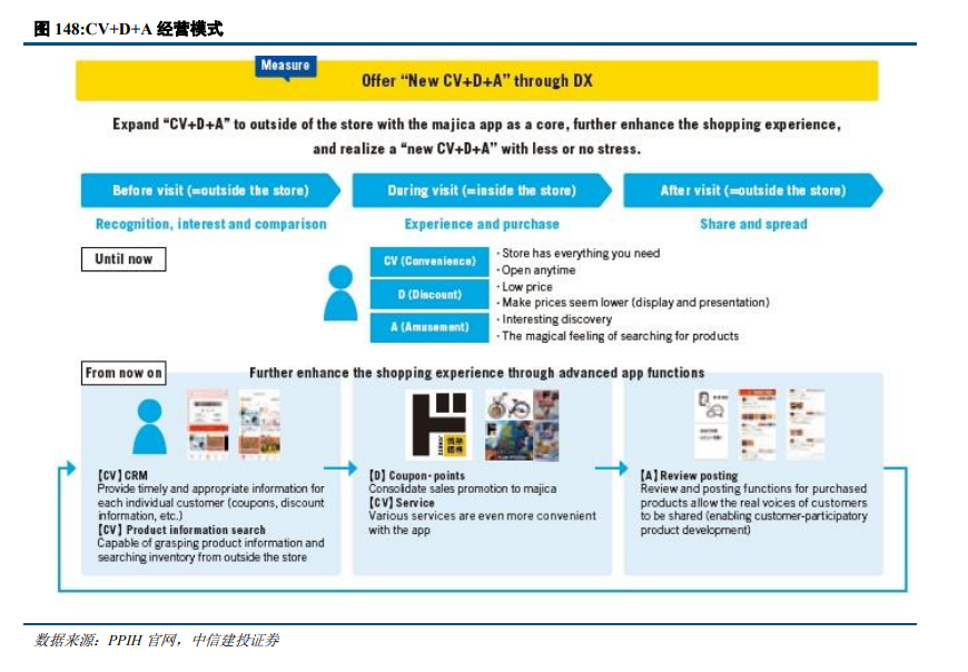 唐吉诃德的经营模式源于尾货销售,通过CV+D+A模式来保证购物体验。CV+D+A的经验理念是为消费者提供便利(CV)、具备性价比(D)和有趣的购物体验。具体举措包括:注重产品质量,保证低价产品的高质量;部分门店7×24小时营业,新冠疫情之前50%左右的营业额都来源于晚八点后;购物时添加非日常性乐趣体验,如吉祥物、探索性购物安排;日常性的折扣保证用户的折扣体验等。