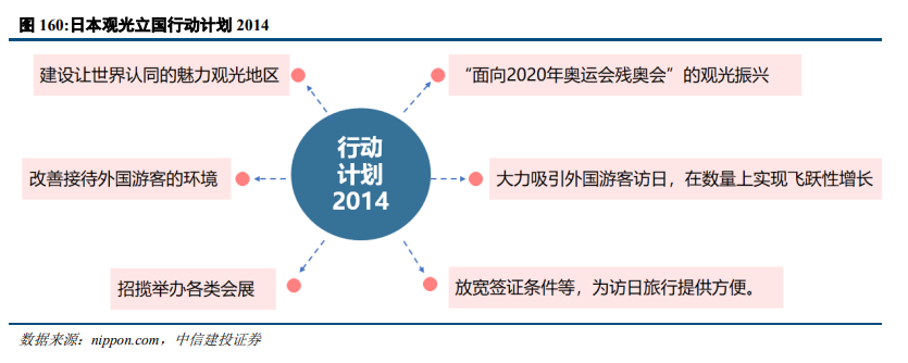日本具有丰富的旅游资源,日本政府大力发展旅游业,实行“观光立国”战略,以此促进经济发展。日本具有丰富的自然风光、历史遗迹和文化资源。早在2003年,日本便确立了“观光立国”政策。安倍政府2013年6月又提出了“日本再兴战略-JAPAN is BACK”,提出了具体的成果指标,称“争取在2030年让访日外国游客人数超过3000万人”,并在“日本再兴战略2014修订版”(2014年6月)中增加了“2020年实现2000万人”的新目标。