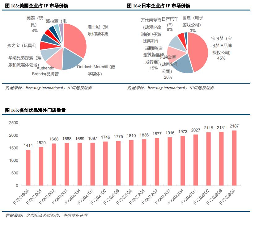 结合IP消费热潮和中国供应链优势,名创优品出海获得成功。美国和日本是重要的IP拥有国,同时也是最大的IP产业市场。名创优品能够以相对低廉价格提供多样的情绪价值产品,满足海外消费者需求,同时依靠强大的运营能力、IP产业资源、灵活的代理模式,公司在海外市场快速扩张。