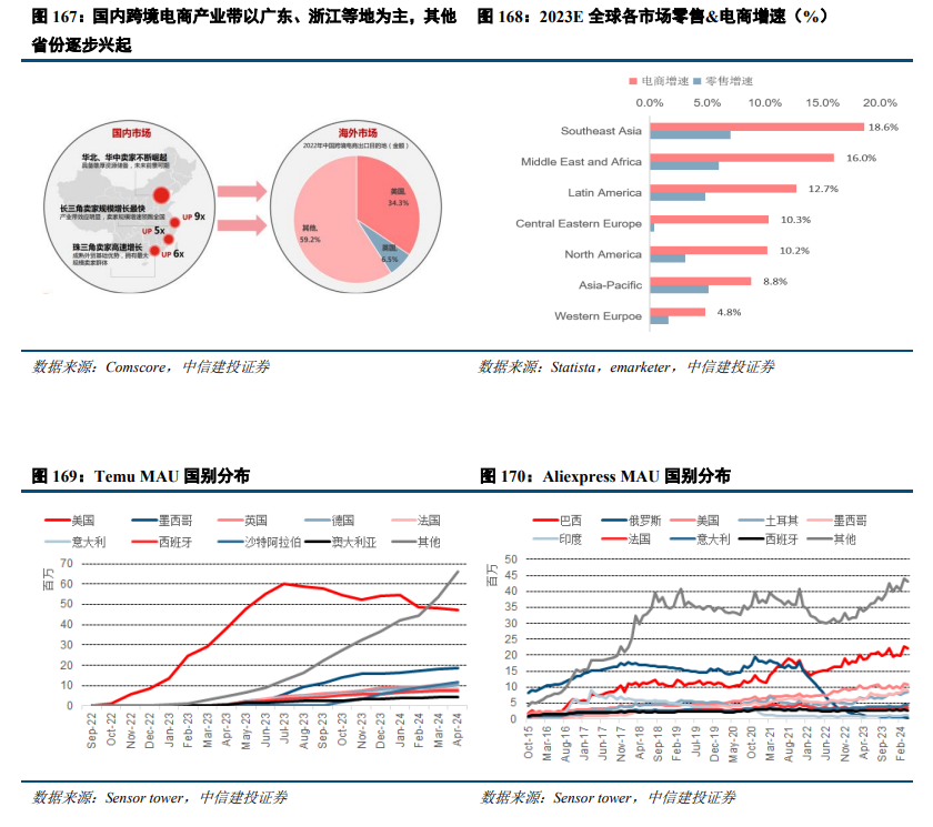 一、早期3P模式:早期平台的出海主要作为3P为主,为国内的卖家提供亚马逊之外的补充渠道,对商家来讲各个平台的竞争力在于商品流量以及配套的服务。早期的3P出海模式则以AliExpress为代表。速卖通能够让全球各地的消费者直接从中国乃至全球的制造商和经销商处购买商品,是阿里巴巴国货出海全球化战略的重要布局。网站上的卖家可以是公司或个人。业务覆盖全球超过220个国家或地区,主要交易市场为俄、美、西、巴、法等国,支持18种语言站点。“仓发+供应+市场”多轮驱动,速卖通综合能力持续提升:(a)仓发:22年以来优选仓订单持续增长,韩国威海仓能做到3日达;海外仓订单同比增长快速,主要来自欧洲和美国市场,在欧洲的核心国家能做到5日左右送达;(b)供应:公司拥有国内优质的公司及个人供应商家,2022年1600余个商家新跃迁为金牌卖家,400多个商家新跃迁为年销售额超过100万美元的卖家,新引入Mall卖家1000余个;随着公司采取全托管模式,公司全球竞争力有望进一步提升。(c)市场:公司在拓展新兴市场亦卓有成效,在韩国、美国、巴西等新兴市场,买家有了大幅增长,Aliexpress的MAU从2022Q3季度开始逐步恢复,未来在国际市场渗透率有望进一步突破。