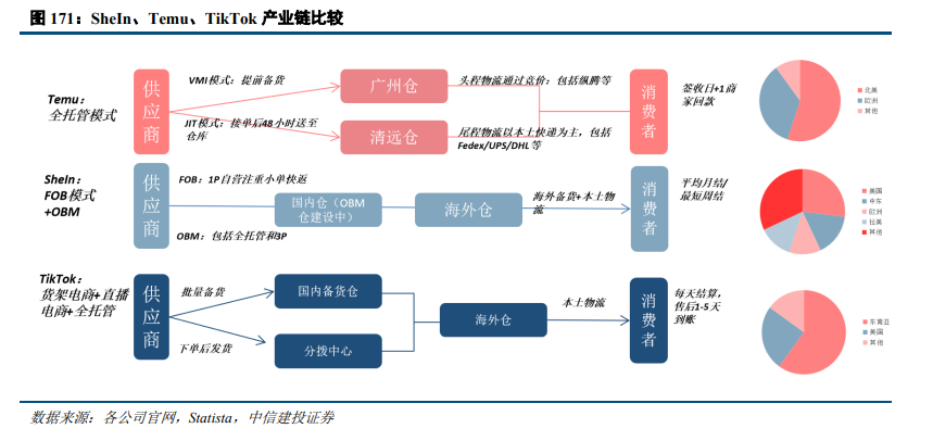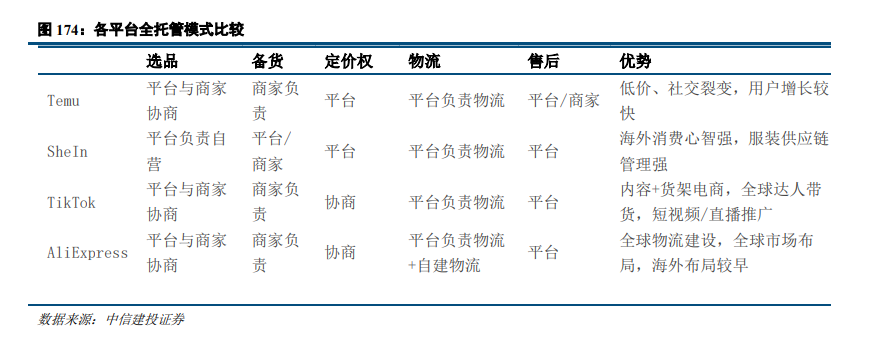 三、全托管&半托管模式:后疫情时代,国内以Temu等平台为代表加大出海力度,早期为了低价吸引用户打开市场,Temu等平台开始采用全托管模式,且随着对时效性与SKU拓展的需求增长,半托管模式也陆续被推出。以Temu为例,在供应链端Temu采取全托管模式(类1P模式),其优势在于终端定价灵活,可保证商品质量,平台无库存风险:1)Temu对商品具备终端定价权:(1)Temu早期可以通过低价吸引用户,在质控严格的条件下,也能够实现较好的用户留存;(2)当Temu平台中某种商品库存较高而需求减少时,库存风险在商家端而非Temu平台,可以通过协商降价的方式降低库存风险;(3)中长期如果公司想要实现OPM提升,或者应对关税成本,均可以通过调整价格实现。2)Temu对质量进行把控避免用户流失:(1)Temu采取类1 P的全托管模式,商品在发出前需要进行质检,在Temu早期可以对质量进行很好地把控,避免因为产品质量问题导致公司用户流失;(2)Temu通过质检不合格或者消费者投诉差评等标准,对商家会进行一定罚款,也可以实现质保和降本的目的。
