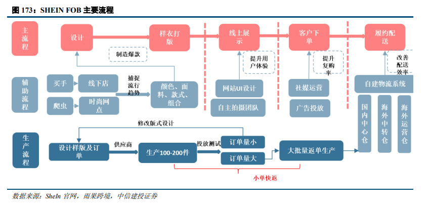 生产端:充分利用中国制造优势与大数据驱动,打造柔性供应链实现服装领域“不可能三角”。SHEIN建立数字化供应链管理系统,与供应商共享客户实时数据,并指导设计、管理生产过程,能够快速分析服装销售数据以及各地消费者的搜索趋势,从而更好地识别消费趋势,再将数据反馈至工厂,实现快速上新,打破了服装领域的“不可能三角”(库存灵活、高性价比、急速上新)。并且SHEIN会针对中小工厂的痛点进行扶持,并为工厂配备指定的面辅料档口、二次工艺厂,便于供应商快速完成生产准备环节。根据晚点LatePost,SHEIN每日会上新数千款SKU,存货周转天数为30天左右,而依赖线下渠道的H&M和Zara周转天数远高于SheIn。