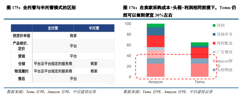 1)半托管目的:Temu虽然GMV起量迅速,但是短板也比较明显,其时效性较慢(如美国区Amazon 1-2天,Temu 1-2周),且因为其头程空运导致其SKU相对受限。而半托管模式可以很好地解决这两个限制。2)针对的卖家:Temu全托管主要针对工厂型卖家,而半托管则更加偏向于拥有仓储和履约物流的卖家;目前拥有这种能力的卖家主要是Amazon的卖家为主,如华凯、三态、本土卖家等;3)议价的空间:我们认为,卖家选择Temu或者Amazon的平台本质上是看重的利润,由于Amazon中间take rate较高,我们测算假设卖家在双平台同利润前提下,Temu仍然可以具备价格优势(假设Amazon终端售价为100¥,在卖家的采购成本、头程物流、获得净利润相同前提下,Temu售价仍然可以比Amazon便宜30%左右);因此Temu半托管的量取决于Temu愿意给卖家的利润空间。