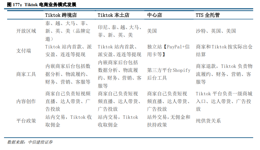 Tiktok电商通过借鉴国内抖音电商发展经验,依托巨大流量入口,将国内成熟模型逐步推广至海外市场。2020年开始,Tiktok在北美、东南亚、欧洲等地逐步开展布局,搭建电商工具体系,完善电商基础设施布局,提供多种形态的电商服务。2023年是TikTok Shop生态圈极速变化的一年,上线美国站点、进入越南市场、首次参与黑五大促、开通全托管模式、大量亚马逊卖家入驻、印尼被封后又重返印尼市场……我们认为,国内抖快的直播电商GMV已经高达4万亿左右规模,而海外尚处于起步阶段,23年以来TikTok Shop动作频频,通过直播、短视频、橱窗等形式带货的“直链消费者”模式已经逐渐被海外消费者所接受和喜爱,而全球经营的内容电商新模式未来有望成为海外重要的电商渠道。Tiktok 2024年目标为500亿美金GMV,随着市场不断开拓叠加全托管等新模式加成,未来Tiktok电商或可对标国内抖音电商,成为Tiktok继广告之后的第二大战略业务。
