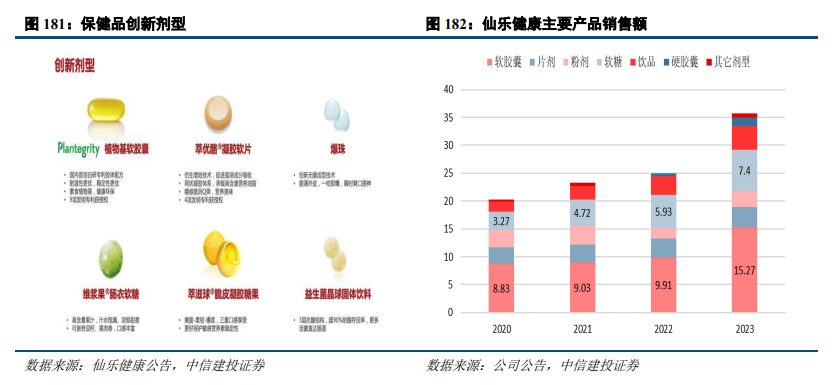 仙乐健康为保健品代工行业龙头企业之一,公司主营业务为保健品CDMO。在产品方面,公司拥有多剂型平台开发能力,产品形态分类主要有软胶囊、营养软糖、饮品等核心剂型,片剂、粉剂、硬胶囊等基础剂型,以及素怡®Plantegrity®植物基软胶囊、萃优酪®凝胶软片、爆珠、维浆果®肠衣软糖、益生菌晶球等创新剂型。在核心剂型和基础剂型上,公司聚焦规模生产,为客户提供全链路、一站式的服务,树立行业标杆。对于创新剂型,公司依托专业的技术研发团队和市场团队,不断推出前沿的营养健康食品解决方案,满足客户的创新需求,为差异化赋能,帮助客户迅速打开市场。公司销售额中软胶囊和软糖占比较大,2023年分别占比42.63%和20.65%。公司致力于为生命的每个阶段提供循证营养产品,并基于战略选择聚焦于抗衰、益生菌、美丽健康、心脑代谢、免疫提升、运动营养六大重点赛道的品类发展,通过加强重点赛道的市场洞察和对客户需求的挖掘,集中资源投入,建立和保持竞争优势。2023年,聚焦赛道的策略初见成效。