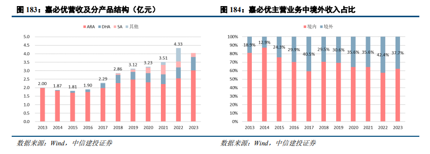 嘉必优是国内最早从事以微生物合成法生产多不饱和脂肪酸及脂溶性营养素的高新技术企业之一,主要产品包括多不饱和脂肪酸ARA、藻油DHA 及SA、天然β-胡萝卜素等,作为膳食营养补充剂和健康功能性食品配料在婴幼儿配方食品、健康食品等领域有着广泛应用。公司率先打破国外垄断,于 2003 年建成国内第一家 ARA 产业基地。2012年,公司实现了藻油DHA 产业化。2023年公司实现营收4.44亿元,其中ARA贡献大部分营收,占比约68.0%。