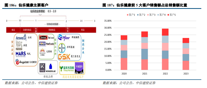 我国保健品行业出海客户主要分布在欧美、澳新等经济较为发达地区。仙乐健康客户主要分布在中国、欧洲、美洲和亚太地区,2023年营业收入分别占比51.67%、29.15%、14.77%和4.41%。其中2023年美洲业务营业收入同比增长93.04%,主要系2023年并表BF所致。公司客户类型涵盖医药企业、直销企业、非直销品牌企业、连锁药店、现代商超、社交电商、食品以及化妆品企业等,其中包括GSK健合、拜耳、玛氏、科汉森、西门子、天猫国际等多家国际知名企业。公司头部客户基本盘稳定,2020年-2023年前五大客户销售额合计占比均维持在20%以上,其中2023年占比22.77%。