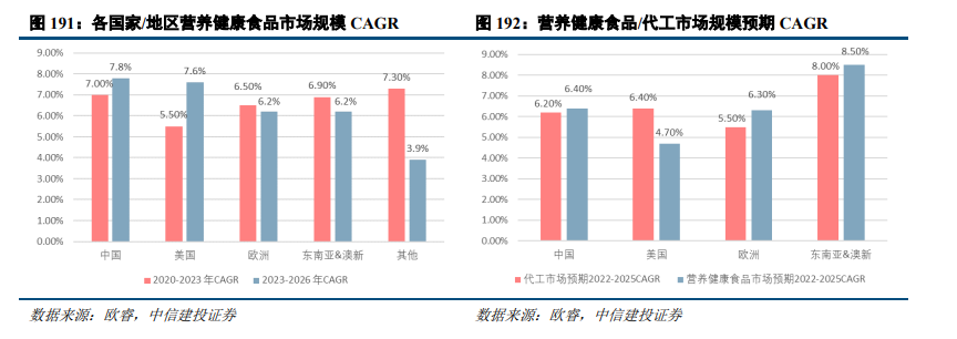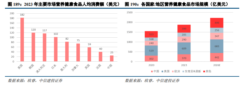保健品行业发展迅速,产品种类丰富,全球化特点突出。2023年全球营养健康食品零售规模超过1870亿美元,过去三年的年均复合增长率为6.5%,预计未来三年将保持6%的稳健增速,到2026年全球规模将达2230亿美元。美国、中国及欧洲仍为全球营养健康食品主要市场,新兴市场如东南亚等也逐渐崭露头角。
