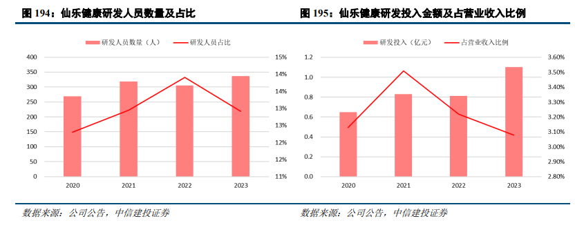 出海优势:研发创新能力突出,市场洞察力具有前瞻性。仙乐健康重视高端技术人才引进和研发投入,持续提升创新能力。经过三十年积累,公司现已构建全面复合型的研发团队,拥有研发人员337人;在中国汕头、上海、马鞍山、德国法尔肯哈根和美国加利福尼亚州设有五大研发中心,专注于营养健康食品的技术和应用创新,聚焦创新剂型研究与孵化、创新原料研究与孵化、循证营养研究、标准研究与安全验证等关键技术领域的深度研究。公司现有超过6000个成熟营养健康食品配方,共取得50项发明专利,布局31项发明专利申请,获得352项保健食品批文。2023年公司加大研发投入,研发投入金额达1.1亿元,同比增长36.89%。