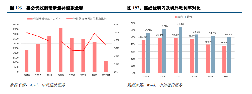 嘉必优客户主要分布在中国、欧美、澳大利亚、新西兰、韩国、东南亚等。境外客户包括了嘉吉(美国)、达能(法国)、帝斯曼(荷兰)等大型跨国公司、境外上市公司及其子公司。公司营收中境外部分占比近年来持续提升,2023年达37.7%。帝斯曼专利保护于2023年6月到期,公司积极推进供应商准入工作,部分海外经销商实现少量商业订单,并且与嘉吉签署了新一轮合作协议,将合作范围扩大至全球市场,公司在全球范围的市场份额有望提升。对比公司业务在境内外的盈利水平,境外毛利率持续高于境内,2023年境外毛利率49.9%,高出境内38.5%毛利率11.5pcts。