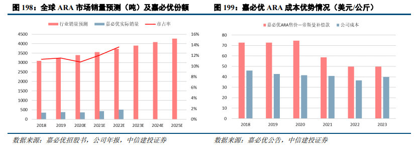 自主研发突破,中国工程师红利提升产品性价比。以嘉必优为例,帝斯曼是ARA全球最大供应商,占据ARA全球大部分份额,嘉必优则是国内ARA 产业的早期培育者和领军企业,占据最大的国内市场份额,同时占据成本优势。从全球来看,公司市场份额在10%-15%,早期即开始规划全球布局。从2012年底开始,公司就帝斯曼专利的使用及海外市场的拓展与帝斯曼展开一系列的谈判,2015年1月,公司与帝斯曼达成和解并签署《和解协议》。根据协议,帝斯曼约定公司在一定领域和范围内销售一定规模的ARA产品,并每年向公司采购一定规模的ARA产品或支付现金赔偿,赔偿额为22.5美元/公斤。从实际执行来看,帝斯曼主要通过支付现金赔偿的方式履行合约。参考2023年情况,嘉必优ARA售价约70美元/公斤,扣除赔偿额22.5美元/公斤,推测帝斯曼生产成本约在50美元/公斤左右。而嘉必优生产成本约30-40美元/公斤左右,相比帝斯曼有一定成本优势。另外,公司产品的出口退税执行国家的出口产品增值税“免、抵、退”政策,出口成本进一步降低。