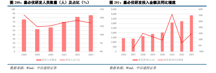 嘉必优研发费用逐年上涨,研发人员占比稳定在15%左右。从2016年开始,公司专注于自主研发,到2023年,公司发明专利已有184个。从2017年开始部分帝斯曼专利区,例如澳大利亚相关专利逐步到期后,公司近年来已逐步展开推广工作。