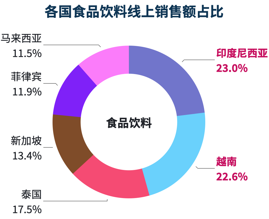 在东南亚电商食品饮料市场中,印尼和越南表现尤为突出,两国合计占据了整个东南亚食品饮料市场的45%以上的市场份额。两个国家的市场规模优势同样体现在细分类目中,印尼是食品赛道线上市场份额最高的国家。在饮料/酒饮和乳制品赛道,越南市场份额位居第一。