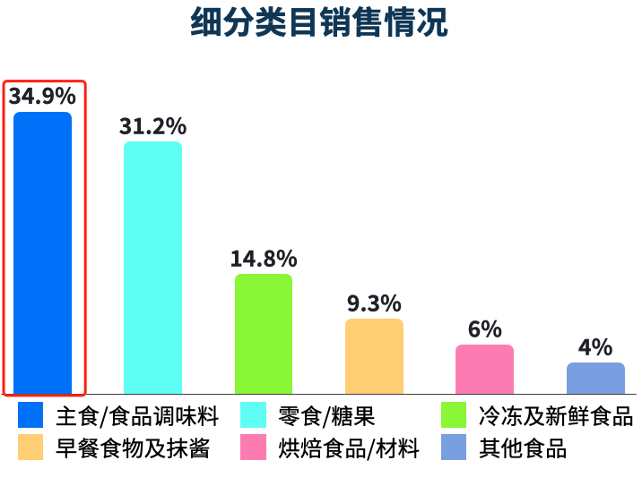 在食品类目中,我们追踪了Shopee和Lazada上近78万个食品产品的销售情况。主食/食品调味料在电商平台的需求量最大,销售额占比约34.9%,其次是零食/糖果。