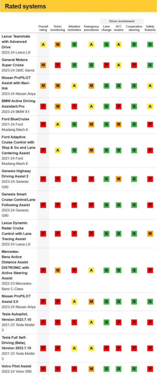 结果惨不忍睹,只有1套系统获得 “良好”(Acceptable)的评价,2套获得“及格”(Marginal),包括特斯拉Autopilot以及FSD在内的11套系统都被评为“差”(Poor)。