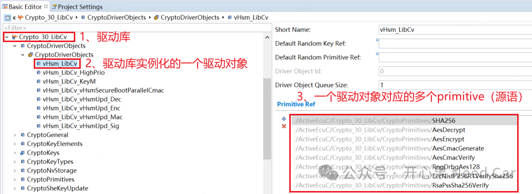 加密驱动程序可以实现一个或多个加密驱动程序对象。加密驱动对象可以在硬件或软件中提供不同的加密原语(Primitive)。一个Crypto Driver的加密驱动对象彼此独立。