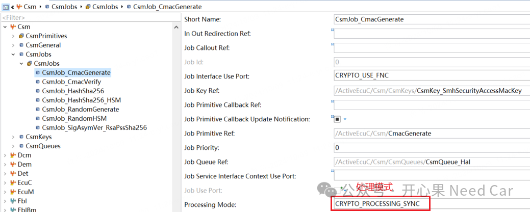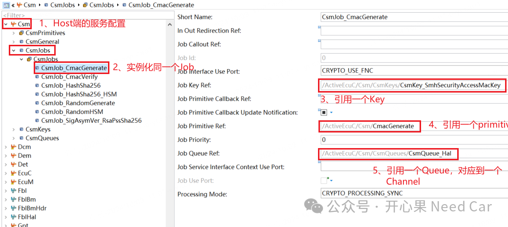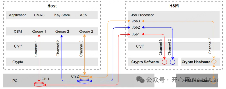 Job一般指CSM模块对应的CsmJob,而且每个CsmJob需要引用一个Key、一个Primitive和一个Channel。如果Host端要使用一个服务,除了在HSM端配置对应的服务以外,Host端需要配置CsmJob,CsmJob示意如下: