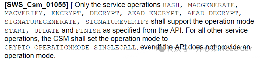 在Autosar的软件架构中,一个服务请求,可以包含多种模式(START、UPDATE、FINISH),说白了就是设计一个状态机,对服务分阶段处理。当然,实际使用中也可以使用CRYPTO_OPERATIONMODE_SINGLECALL模式,一次性完成三个状态处理。关于哪些服务可以使用什么模式请求,可以参考Autosar规范,如下所示: