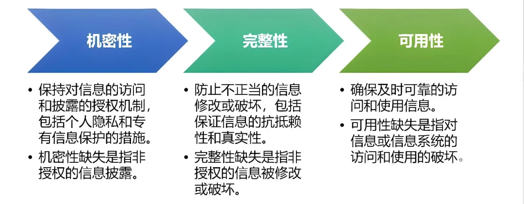 《CISSP官方学习指南》这部经典的书中提到安全管理概念与原则是安全策略和解决方案部署中的固有元素,常常被简称为信息安全CIA三元组:机密性(Confidentiality)完整性(Integrity)可用性(Availability)。信息安全原则就包括了安全的主要目的和目标。