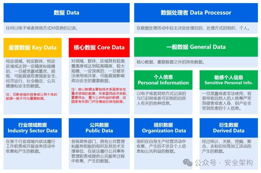 根据数据在经济社会发展中的重要程度,以及一旦遭到泄露、篡改、损毁或者非法获取、非法使用、非法共享,对国家安全、经济运行、社会秩序、公共利益、组织权益、个人权益造成的危害程度,将数据从高到低分为核心数据、重要数据、一般数据三个级别。
