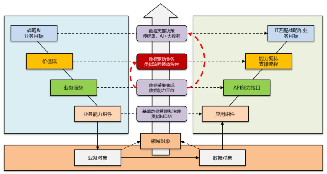 数据驱动这条线也应该是从底朝上纵向贯通的,而且也存在和业务和应用的V模型匹配,形成了横向+纵向的双向贯通。