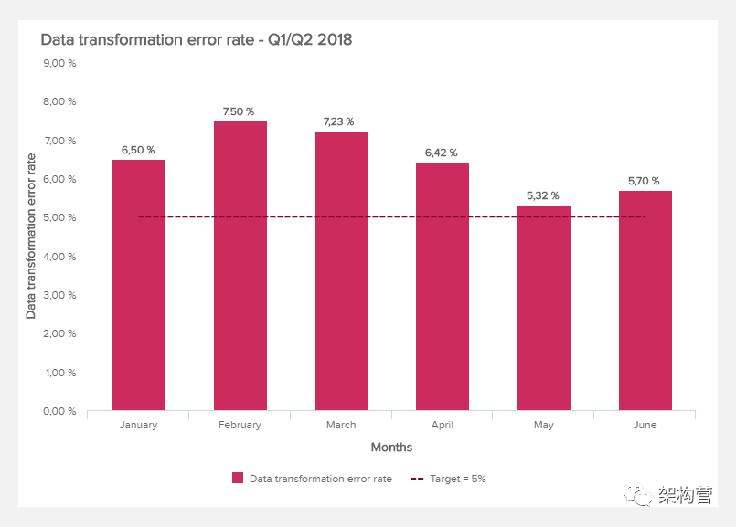 在这里,这一切都归结为数据转换错误率。要使用的指标跟踪相对于整体而言有多少数据转换操作失败,或者换句话说,跟踪获取以一种格式存储的数据并将其转换为另一种格式的过程未成功执行的频率。在下面的示例中,转换错误率随时间推移表示:
