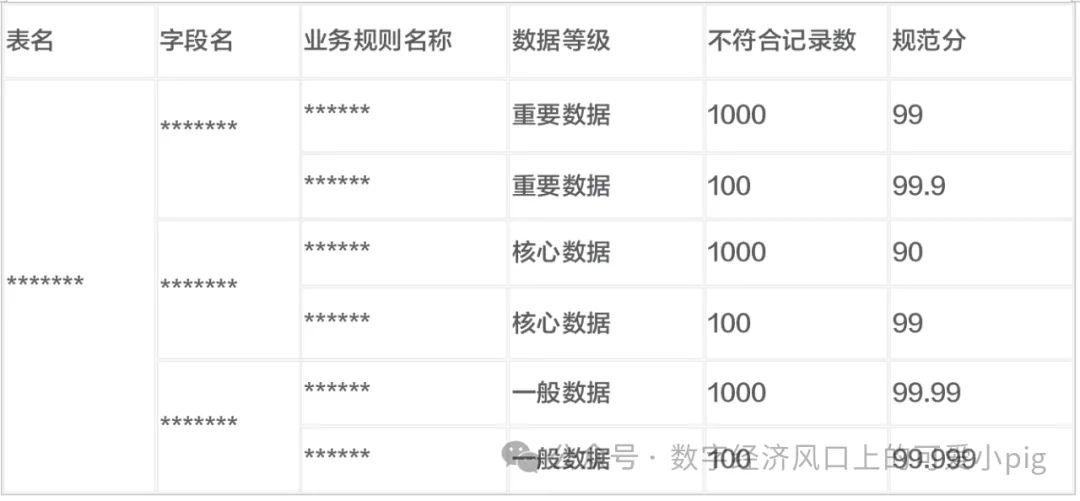 方法二:第一步需要识别数据等级,按照字段维度识别出核心数据、重要数据、一般数据,并基于不同的等级给出不同的判断依据,比如核心数据不符合记录数超过100条,则赋分99分,核心数据不符合记录数超过1000条,则赋分90分,重要数据不符合记录数超过1000条,则赋分99分,一般数据不符合记录数超过10000条,则赋分99分等;