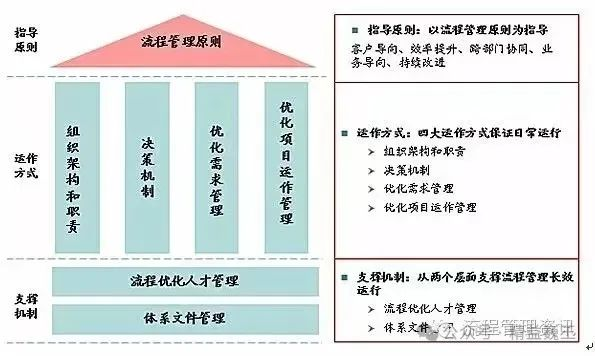 在运作层,设计了四大运作方式保证流程管理的日常运行,分别是流程管理的组织架构和职责、流程管理决策机制、流程优化需求管理和流程优化项目运作管理。