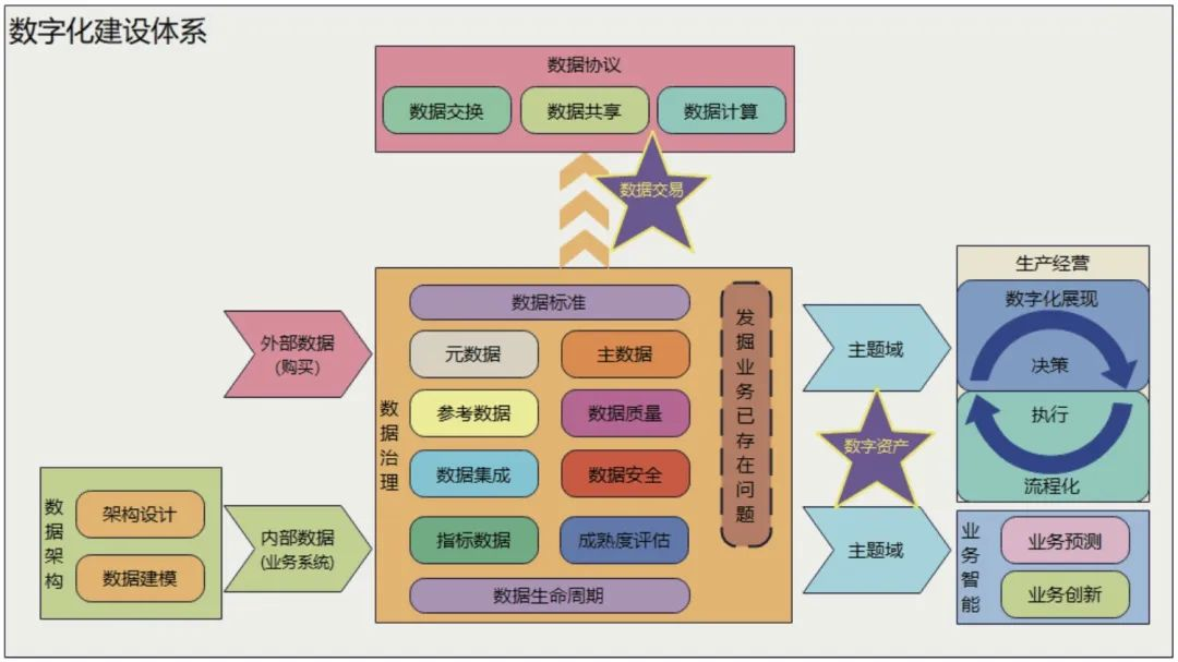 如图1所示,数字化建设体系共分为5个部分:数据架构、数据治理、生产经营、业务智能和数据协议,如下。