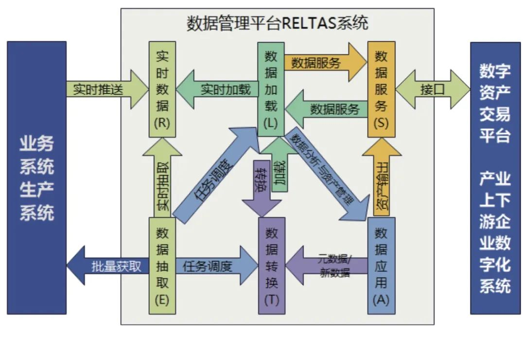 如图3所示,数据管理系统平台由实时数据处理(R)、数据批量抽取(E)、数据加载(L)、数据清洗转换(T)、数据应用(A)和数据服务(S)共6个部分组成,系统命名RELTAS。具体功能介绍如下。